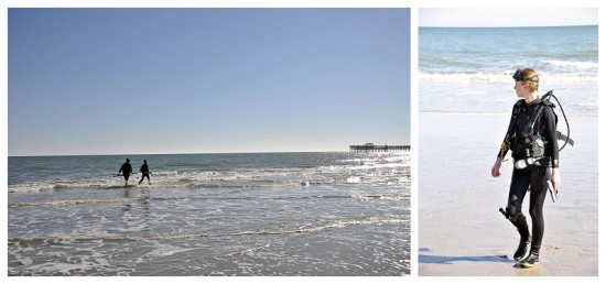We hobbled up the rickety wooden steps to the beach and deflated further when we saw how far out the ocean was! We staggered across the sand to the waters edge and I couldn’t take the tank any more! I had to take it off, it just weighed too much and I could barely move! Alex had his taken off too and we prepared to go into the 4 degree water. By prepared I mean we mentally had a word with our selves as Larry poured near boiling water into our wetsuits through the head hole! Once we were human hot water bottles it was time to wade out into the big blue inhospitable Atlantic Ocean.