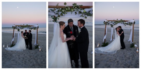 I was so pleased to see Alex even though he was dressed in his James Bond suit and probably roasting while I froze to death but just the sight of his face warmed me through. I got dried and told everyone that we needed to get into action before we lost the light for the wedding ceremony. I was dried, my hair was whisked into shape, my make up applied at the same time and water poured into my mouth as I was pinned into yet another AMAZING gown from Amandas. I was soon ready to rock and the sky had just started to turn a dusty pink. Alex ran on to the beach to meet me at the alter that Gigi Noelle Events had built beautifully. It was covered in flowers, flowing materials and surrounded by candles in hurricane lanterns. It was perfect. I walked across the cold sand and met Alex and Reverend Benji Simmons began the ceremony.
