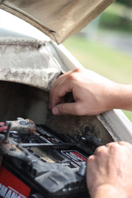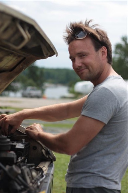 spanner in Canada it is a wrench) and managed to get the battery out from under the bonnet. After looking at it gormlessly for 20 minutes and staring under the bonnet scratching our heads for another 20 we decided we didn’t know what was wrong so battery in hand we headed toward Canadian Tire. Have you ever tried to pick up a car battery? I have…they are heavy! Have you ever carried one half a mile? No, I haven’t either…but Alex has. On our way a 900 year old man and his wife asked if we wanted a lift in his bright red 3 door 1962 VW golf convertible as the battery looked heavy. We said ok thank you very much and went to get in but the seats didnt pull forward so they got out while we climbed in over the doors into the back seat which was full of fishing rods and fishing gear and eventually us and a battery. After all that they drove us the last 100 meters to the Canadian Tire. He kindly dropped us at the wrong door so we had to walk the hundred meters anyway but now with new scrapes and bumps from getting in and out of the car, getting hooked on a fishing rod and Alex hitting himself in the shin with the battery trying to climb out of the car!